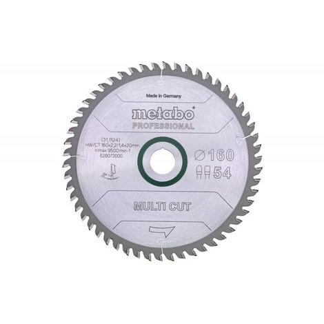 Lame de scie circulaire Multi cut diamètre 230mm Metabo, pour la découpe de nombreux matériaux exigeants : aggloméré laminé, profils fins en plastique, aluminium, cuivre, laiton, bois massif, panneaux à particules, plaqués, MDF etc. Alésage 30mm et épaisseur 2.6mm. 60 dents. Requière une puissance élevée sur la scie circulaire. Avance relativement lente de la lame. Lame en carbure de tungstène / pointe au carbure. Denture en biseau alterné (WZ) : coupes très nettes dans les bois tendres ou durs, les matériaux en fibre de bois, les stratifiés et le plastique. Facile à affuter. Angle d’attaque négatif : utilisable sur des scies à onglets. Compatible notamment avec la scie circulaire KS 85 de Metabo.