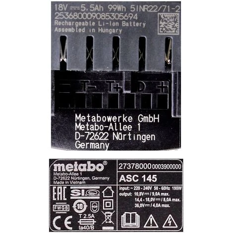 Grâce à la nouvelle technologie LiHD, Metabo est le seul fabricant au monde à couvrir toute la plage de puissance, de 400 à 3200 watts. Les applications qui n’étaient auparavant réservées qu’aux machines réseau les plus puissantes sont désormais possibles sans fil grâce à la batterie 5,5 Ah. La combinaison de nouvelles cellules hautes performances et de composants entièrement nouveaux de la batterie LiHD garantit des performances ultimes et une utilisation extrêmement longue avec un développement de température minimal. L’interaction de technologies coordonnées, telles que La gestion intelligente des batteries et la surveillance électronique permanente à cellule unique garantissent aux batteries une durée de vie particulièrement longue. L’affichage de capacité intégré permet une vérification permanente du niveau de remplissage. La protection optimale contre la pollution interne, le revêtement de protection complet de l’électronique ainsi que l’étanchéité optimale dans la construction du couvercle garantissent une longue durée de vie sans presque auto-décharge. Le revêtement extérieur en caoutchouc de la batterie assure un support sûr et antidérapant et sert également de protection contre les chocs. Le chargeur convient à la charge de toutes les batteries Li-Ion et LiHD à siège coulissant (12V-36V) avec un courant de charge de batterie adapté de Metabo. Le refroidissement breveté de la batterie AIR COOLED garantit des temps de charge considérablement réduits lors du chargement. L’ASC 145 impressionne avec une très faible puissance d’enregistrement en veille. La gestion intelligente de la charge contrôlée par le processeur garantit une charge douce et un nombre maximal de cycles de charge. La compatibilité à 100% avec toutes les machines et chargeurs 18 V des partenaires CAS (Cordless Alliance System): Rothenberger, Edding, Fischer, Mafell, Collomix, Eibenstock, Eisenblättert, Haaga, Starmix, Steine, Rokamat, Birchmeier fabrique la batterie et le chargeur à une batterie et un chargeur pour tout.