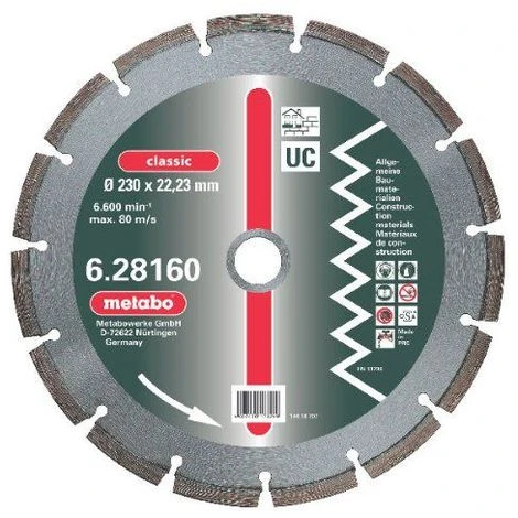 Meule de tronçonnage diamantée DIA-TS 230X22,23 mm La meule de tronçonnage diamantée Metabo possède une bonne capacité de coupe, ainsi qu’une longévité optimale Caractéristiques techniques de la meule de tronçonnage diamantée DIA-TS : – Est bien adaptée à tous les matériaux de construction tels que le béton, le béton lavé, grès dur, et la brique en terre cuite – Segments diamantés soudés au laser : hauteur de segment : 7 mm, vitesse de travail maximal : 80m/sec (300 à 400mm : 100m/sec)