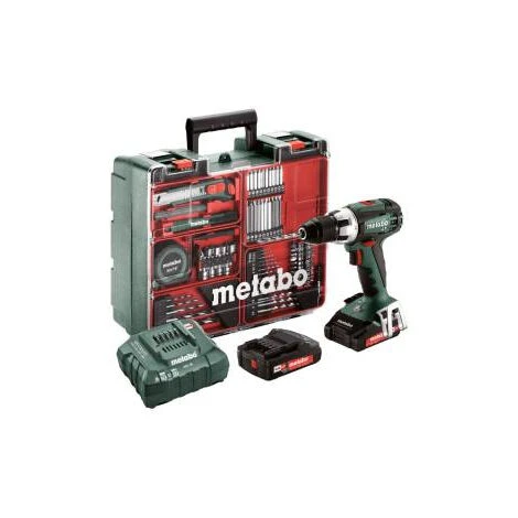 Cette perceuse – visseuse puissante 18V est destinĂ©e aux travaux exigeants. AccompagnĂ© de son atelier mobile (accessoires de percage et outils), ce coffret possĂšde alors de nombreux accessoires pour le perçage, et vissage et plus encore !  Les 4 pĂŽles du moteur de la machine permettent un perçage et un vissage rapide. Son couple de rotation jusqu’Ă 60Nm lui confĂšre une puissance importante utile pour les gros travaux, la charpente etc.  Il est possible de travailler sans mandrin grĂące Ă sa broche Ă six pans creux pour les embouts de vissage.  Les deux batteries Li-Power de 18V / 2.0 Ah, le chargeur ASC 55  » Air Cooled  », le mandrin Ă serrage rapide, le crochet de ceinture et chargeur d’embouts sont livrĂ©s avec ce set d’accessoires dans un coffret en plastique. Les batteries sont compatibles avec toutes les machines 18V de la gamme Metabo et plusieurs autres marques. Elles peuvent se combiner avec toutes les batteries 18V et tous les chargeurs des marques du CAS (Cordless Alliance System). Une lampe est intĂ©grĂ©e Ă l’appreil pour Ă©clairer votre zone de travail.   Contient : Une perceuse visseus BS 18 LT 2 batteries Li power 2Ah + un chargeur Un coffret Un set d’outils de vissage, de perçage et de bricolage intĂ©grĂ© au coffret.      VALEUR DE REFERENCE :  Type de batterie : Li-Power Tension de la batterie : 18V CapacitĂ© de la batterie : 2 x 2 Ah Couple de rotation maximum tendre : 34 Nm Couple de rotation maximum dur : 60 Nm Couple de rotation rĂ©glable : 0.7 – 0.8 Nm DiamĂštre de perçage dans l’acier : 13 mm DiamĂštre de perçage dans le bois tendre : 38 mm Vitesse de rotation Ă vide : 0 – 450 / 0 – 1600 / min Ouverture de mandrin : 1.5 – 13 mm Poids sans batterie : 1.3 kg Poids avec batterie : 1.7 kg  VIBRATION :  Perçage du mĂ©tal : 2.5 m/sÂČ Incertitude de mesure K : 1.5 m/sÂČ Visser sans percussion : 2.5 m/sÂČ Incertitude de mesure K : 1.5 m/sÂČ Â EMISSION ACOUSTIQUE :  Niveau sonore : 73 dB (A) Niveau de puissance acoustique ( LwA ) : 84 dB (A) Incertitude de mesure K : 3 dB (A)     Garantie 2 ans + 1 an supplĂ©mentaire en vous inscrivant sur le site de Metabo.  Â
